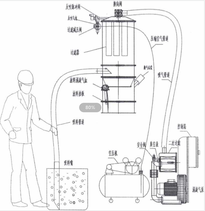 真空加料機(jī)中裝有壓縮空氣反吹裝置,每次放料時(shí),壓縮空氣脈沖反吹過(guò)濾器,把吸附于過(guò)濾器表面的粉末打落下來(lái),以保證吸料能正常運(yùn)行。