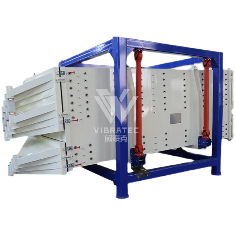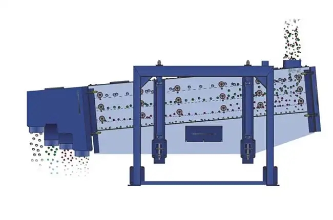 FYBS方形搖擺篩的工作原理為:篩機啟動后,篩機搖動體即篩箱在慣性力的作用下作前后往復(fù)運動,篩箱帶動篩面作周期性搖動,從而使篩面上的物料隨篩箱一同作定向跳躍式運動,期間,小于篩面孔徑的物料通過篩落到下層,成為篩下物,大于篩面孔徑的物料經(jīng) 連續(xù)翻滾跳躍運動后從排料口排出,*終完成篩分工作。