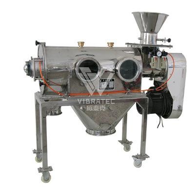 WQS氣流篩的篩網(wǎng)為圓筒狀,置于機(jī)體內(nèi),物料通過(guò)螺旋輸送系統(tǒng)后,與氣流混合、霧化進(jìn)入網(wǎng)筒內(nèi),通過(guò)網(wǎng)筒內(nèi)風(fēng)輪葉片的高速旋轉(zhuǎn)使物料同時(shí)受離心力和旋風(fēng)推進(jìn)力,從而使物料噴射過(guò)網(wǎng),過(guò)網(wǎng)的物料由細(xì)料出料口排出,不能過(guò)網(wǎng)的物料沿網(wǎng)筒壁從粗料出料口排出,達(dá)到快速分離的目的。