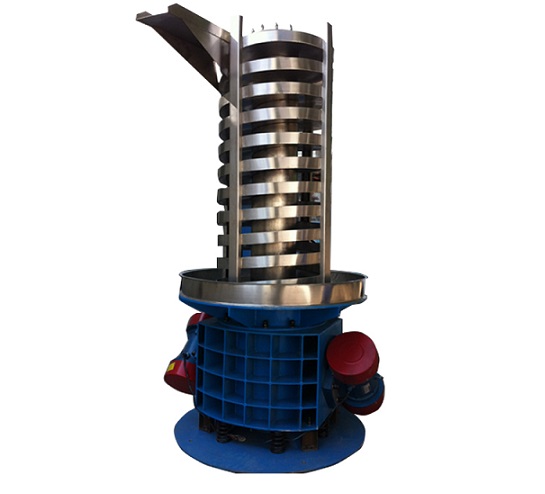 當垂直提升機工作時,根據(jù)雙振動電機自同步原理,由振動電機產(chǎn)生激振力,強迫整個輸送塔體作水平圓運動和向上垂直運動的空間復合振動,螺旋槽內(nèi)的物料則受輸送槽的作用,作勻速拋擲圓運動,沿輸送槽體向上運動,從而完成物料的向上(或向下)輸送作業(yè)。
